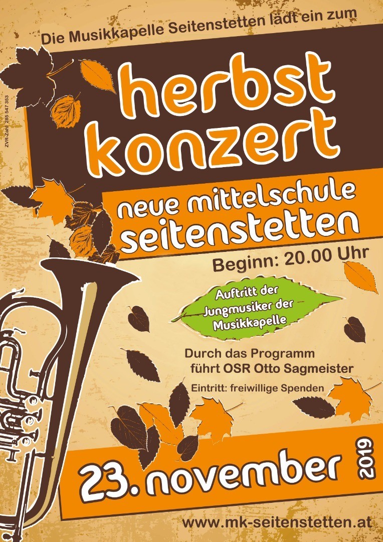 Die Musikkapelle Seitenstetten möchte Sie herzlich zum Herbstkonzert 2019 am Samstag, den 23. November 2019 um 20.00 Uhr im Turnsaal der „Mittelschule“ einladen. Geboten wird ein buntes Programm - von der Klassik bis zur Moderne!