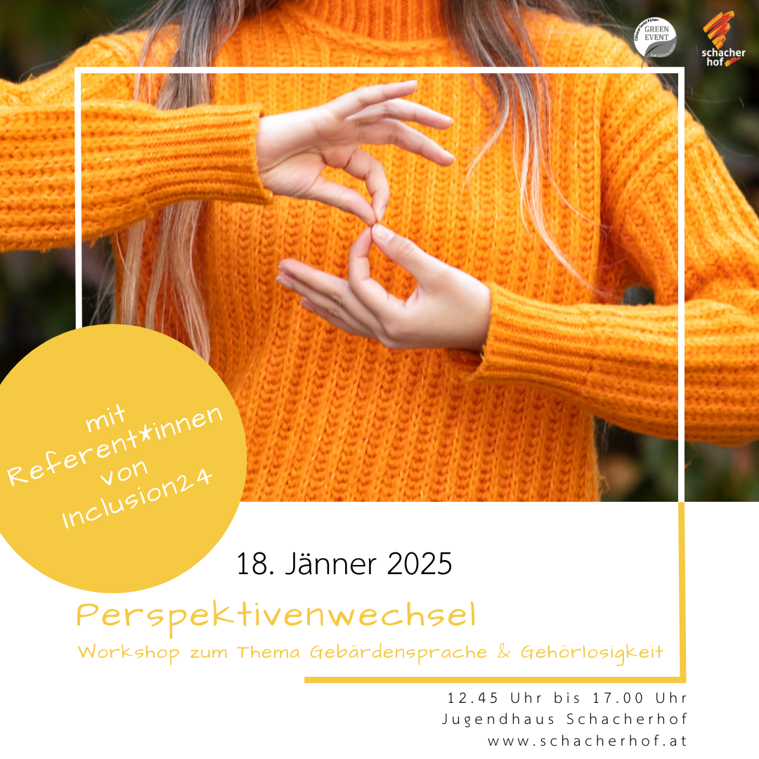 Am 18. Jänner 2025 öffnet das Jugendhaus Schacherhof in Seitenstetten seine Türen für eine besondere Veranstaltung: Unter dem Motto „Perspektivenwechsel“ lädt das Haus alle Interessierten dazu ein, die Welt der Gehörlosigkeit und Gebärdensprache näher kennenzulernen.